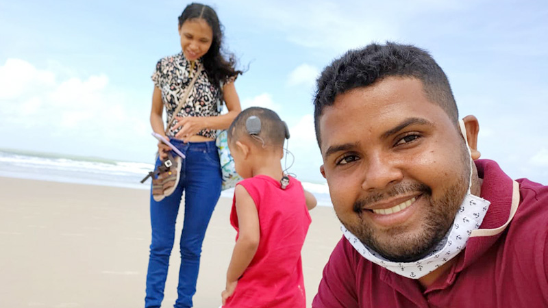 Após exames confirmarem a obstrução auditiva, a família conheceu a MED-EL por meio da médica otorrinolaringologista e da fonoaudióloga que o acompanhavam. “Quando vi o processador de áudio RONDO 2 da MED-EL, fiquei encantado. Disse a mim mesmo: ‘Meu filho vai ouvir através desse aparelho’.”