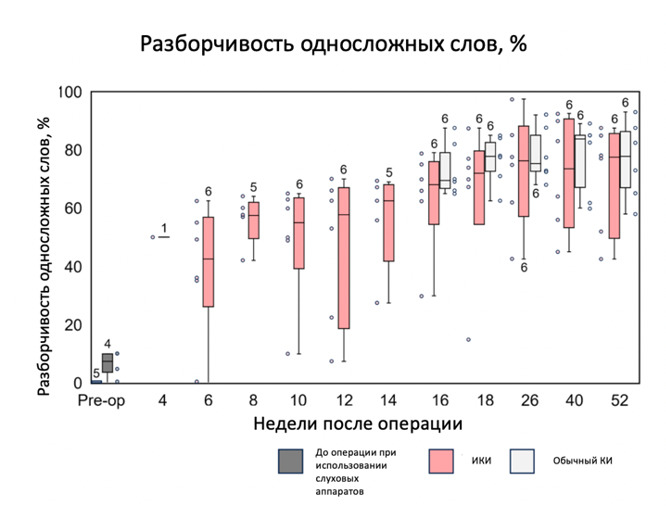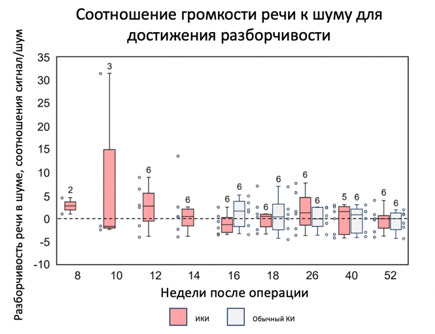 Оказалось, что через год после имплантации в среднем уровень разборчивости речи в тишине и в шуме у пациентов с полностью имплантируемым КИ не отличается от пациентов с обычным КИ (На графиках пользователи с обычным КИ указаны белыми столбцами, пользователи полностью имплантируемых — красными).