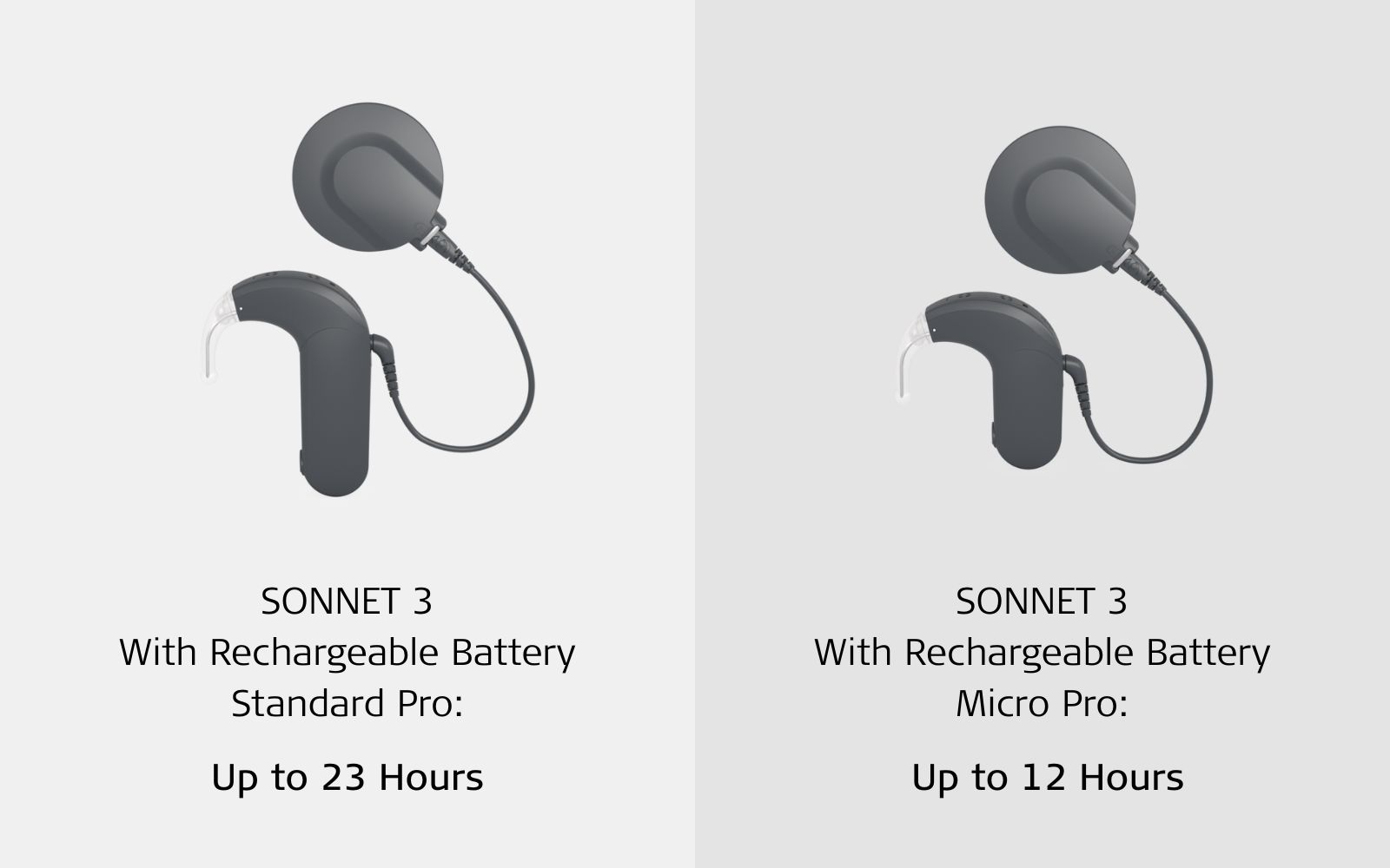 The rechargeable battery Standard Pro can power your SONNET 3 for up to 23 hours. That gives it the longest battery lifetime of any rechargeable BTE audio processor.